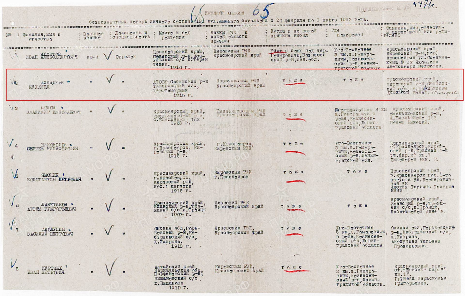 1915 г.р.. Род. в Казанской губерн., Сабинская вол., д.Тимершик. Призван Казачинским РВК в августе 1941 г..