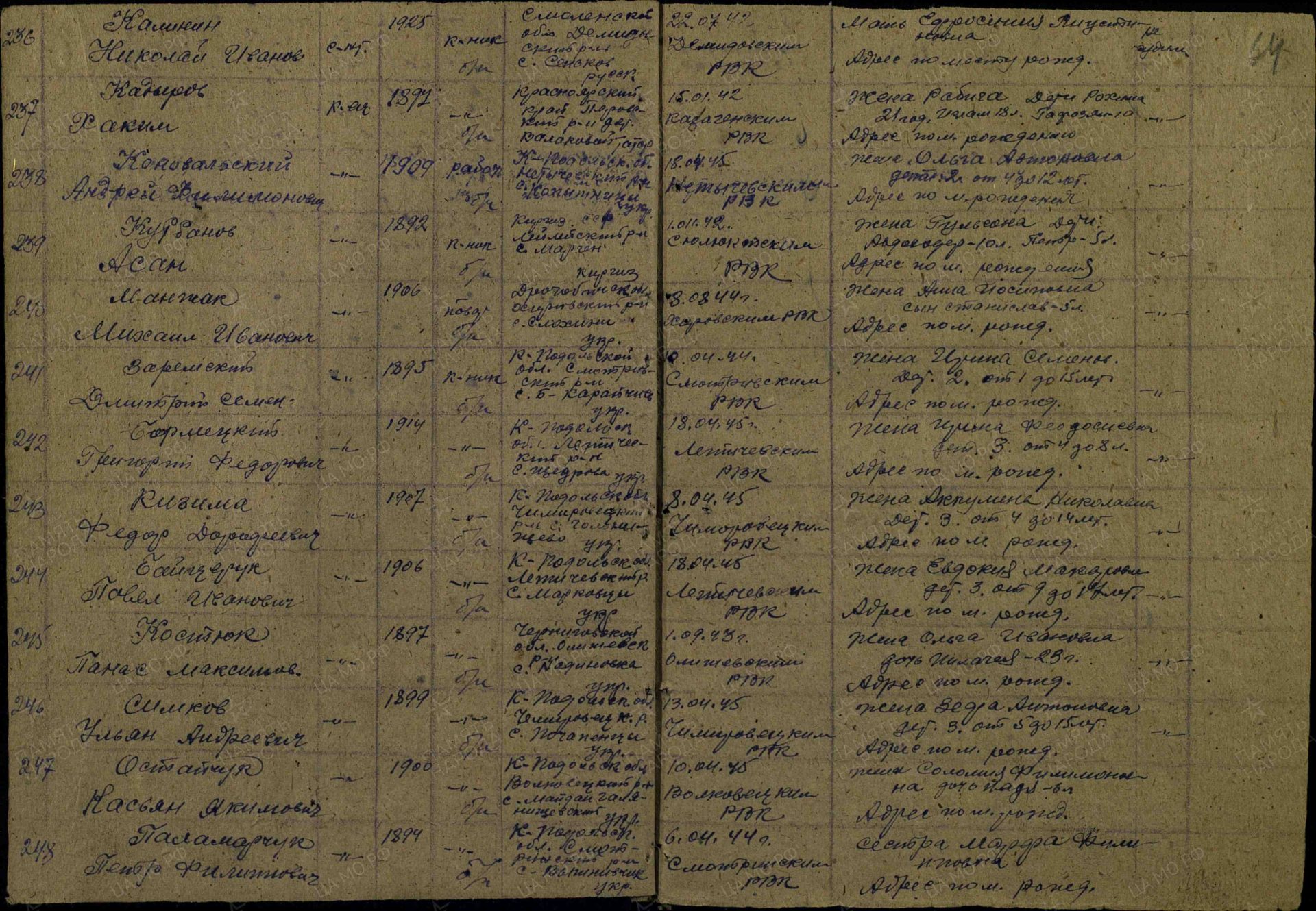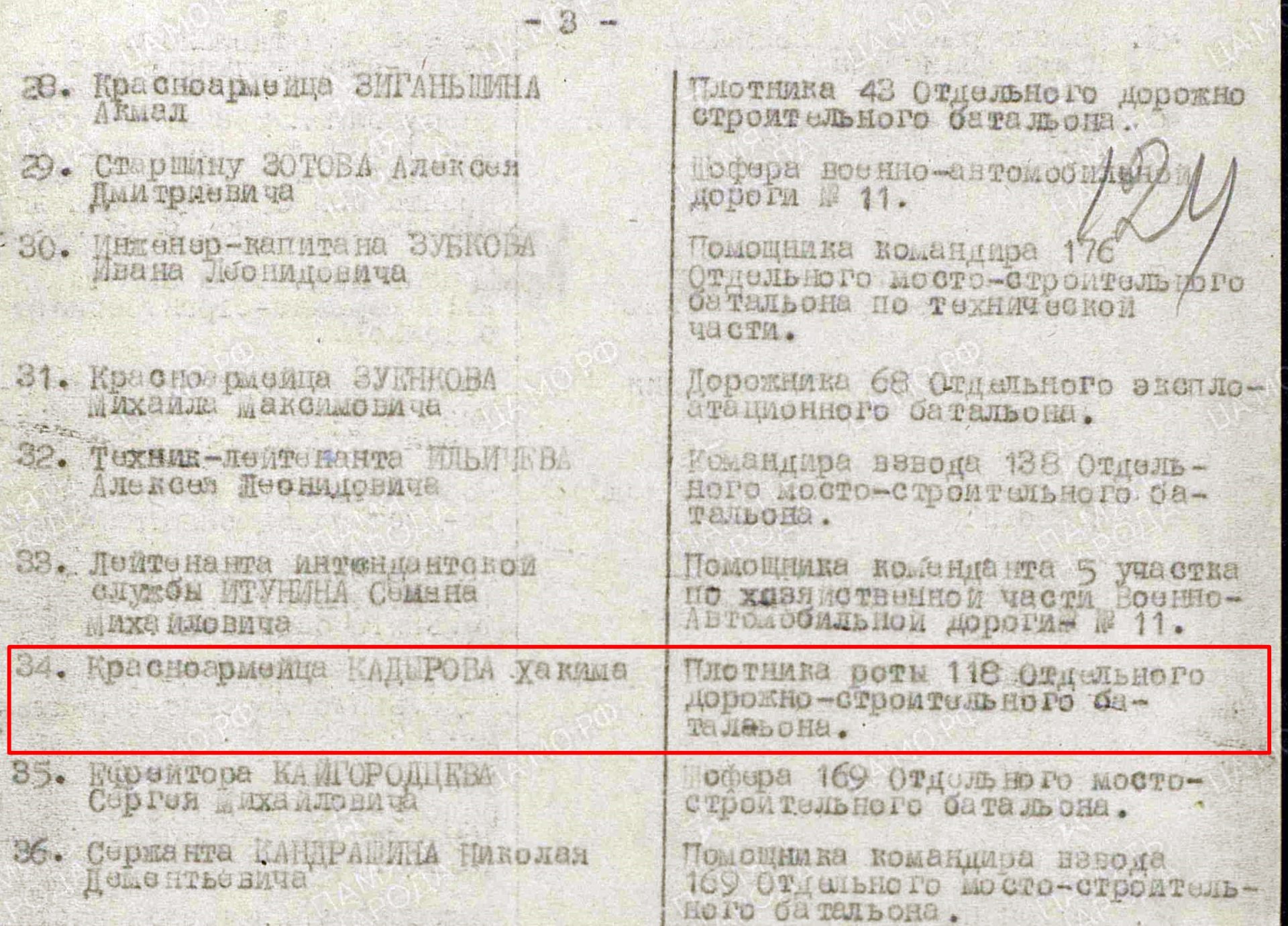 1897 г.р.. Род. в Казанской губернии, Сабинском узде, д.Тимершик. Призван Казачинским РВК 12.03.1942 г.. Красноармеец, плотник.