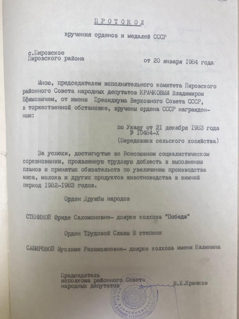 А за многолетний труд и высокие достижения в работе получила орден Дружбы народов (1983) и медаль «За трудовую доблесть» (1975).